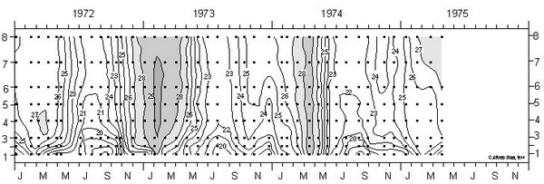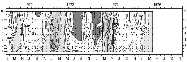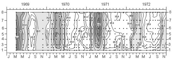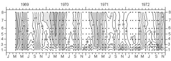 A) Radial "Baia-Farta" - Salinidade e Temperatura (Cº) à superfície, 1969-1972 B) Radial "Baia-Farta" - Salinidade e Temperatura (ºC) à superfície, 1972 -1975