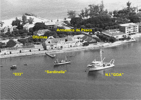 O "N.I.GOA", a Traineira "SARDINELLA" e a Lancha "033", fundeados frente às instalações da MEBPA (Oficinas) na Baía do Lobito.