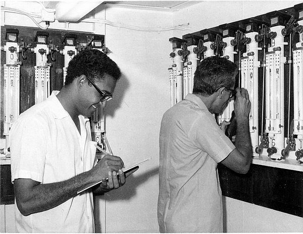 "N.I.GOA". Leitura dos termómetros de inversão das garrafas Nansen , após a execução de uma estação hidrológica.