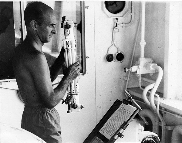 "N.I. GOA". Garrafa Nansen pronta a ser colocada no cabo oceanográfico durante a execução de uma estação hidrológica.