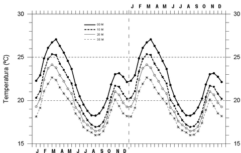 Variação da salinidade e da temperatura na Estação Fixa do "Lobito" no ano médio 1968-1975, nos níveis de profundidade de 35 metros (o ano médio está repetido para melhor visualização das variações).