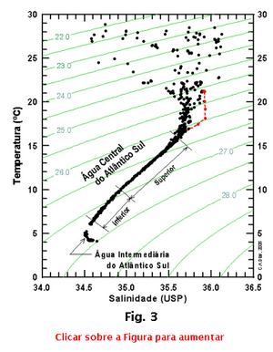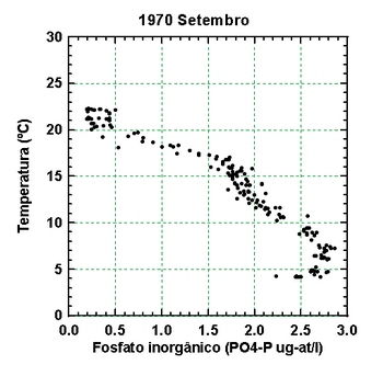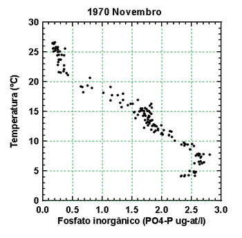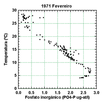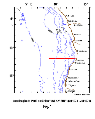 A observação da radial oceânica "12º Sul", situada ao longo do paralelo de 12º Sul, desde a plataforma continental até cerca de 300 milhas náuticas (560 km) fora, teve por finalidade a caracterização estacional da troposfera oceânica (da superfície até aos 1000 metros de profundidade) frente à zona central da costa de Angola. A radial foi observada nos seguintes cruzeiros do N.I."Goa" ![]() ![]() ![]() ![]() ![]() Em cada cruzeiro realizaram-se 5 estações oceano- gráficas até à profundidade máxima de observação de 1000 m, e 7/6 estações intermediárias até aos 500 m. Na zona correspondente à vertente continental (dos 250 aos 1000 m) obtiveram-se ainda registos batitermográficos até aos 500 m (Batitermógrafo electrónico de sonda perdida - XBT) com o objectivo de melhor localizar o veio subsuperficial da "Corrente de Angola" através das deformações das isotérmicas e das isohalinas. Em todos os níveis padrão de observação (0, 10, 20, 30, 50, 75, 100, 150, 200, 250, 300, 400, 500, 600, 800 e 1000 metros) além dos dados de temperatura e de salinidade, obtiveram-se ainda dados de Oxigénio, Fosfatos e Silicatos inorgânicos na água do mar [ver Figuras 2-1 a 2-6]