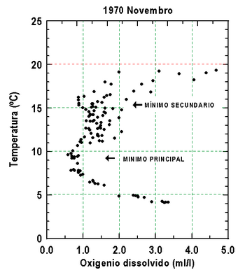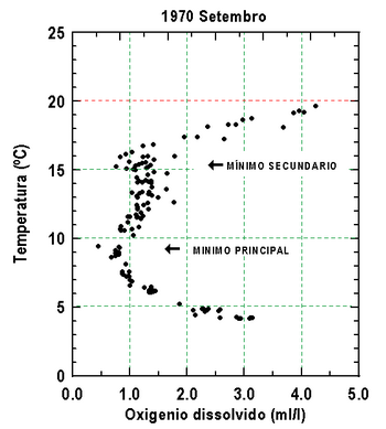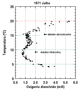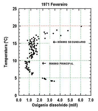 Relação entre a temperatura (ºC) e o oxigénio dissolvido (O2 ml/l) em cada uma das Radiais (para temperaturas < 20ºC).